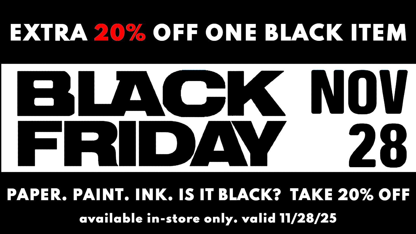 BLACK FRIDAY OFFER - 20% OFF ANY ONE BLACK ITEM. IN-STORE ONLY. OFFER VALID 11/28/25 ONLY.